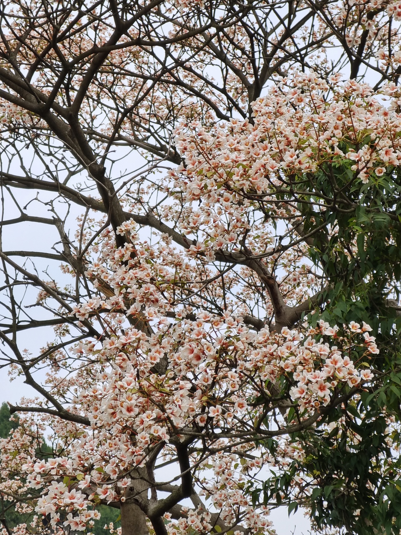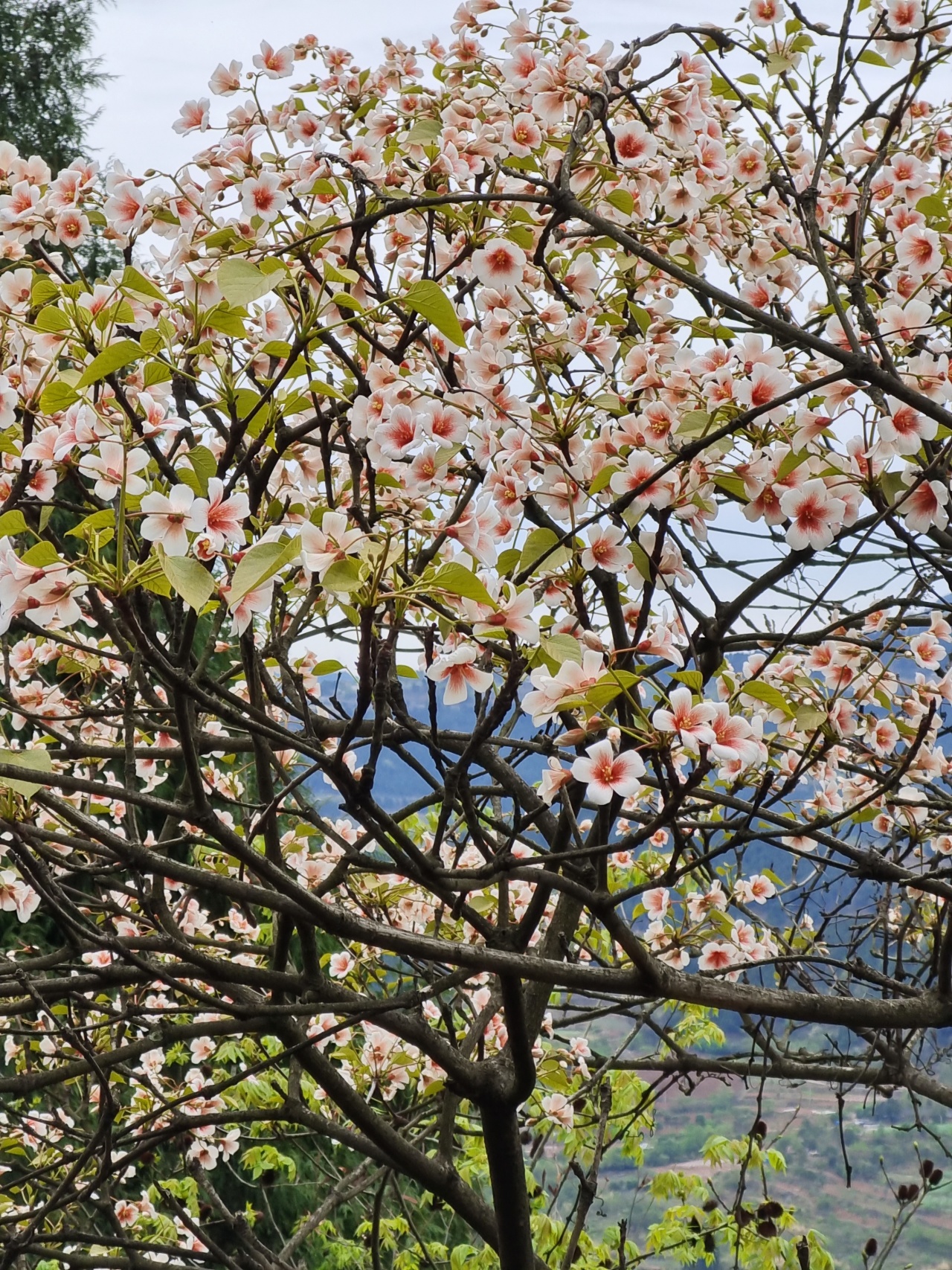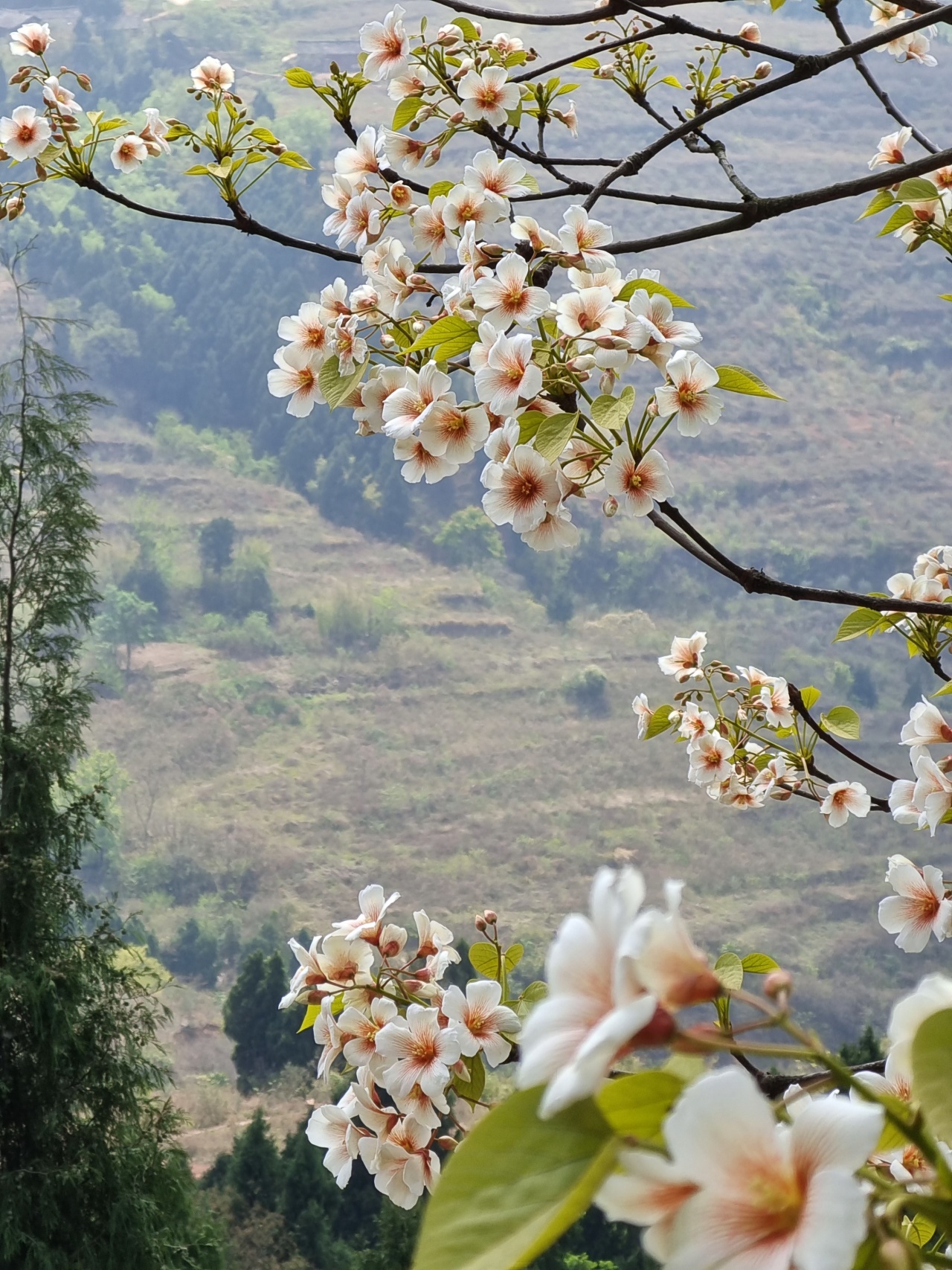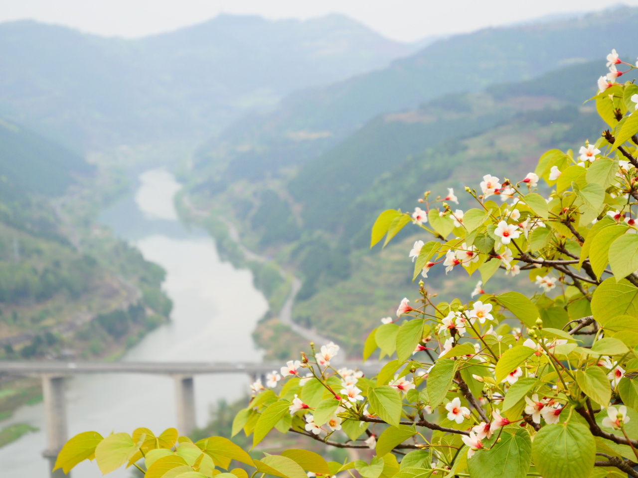 一树树桐子花像淡淡的云团飘浮在山坡上,与远景中的沱江山峡、成巴高速大桥和达成铁路构成了一幅浑然天成的龙泉山美景。