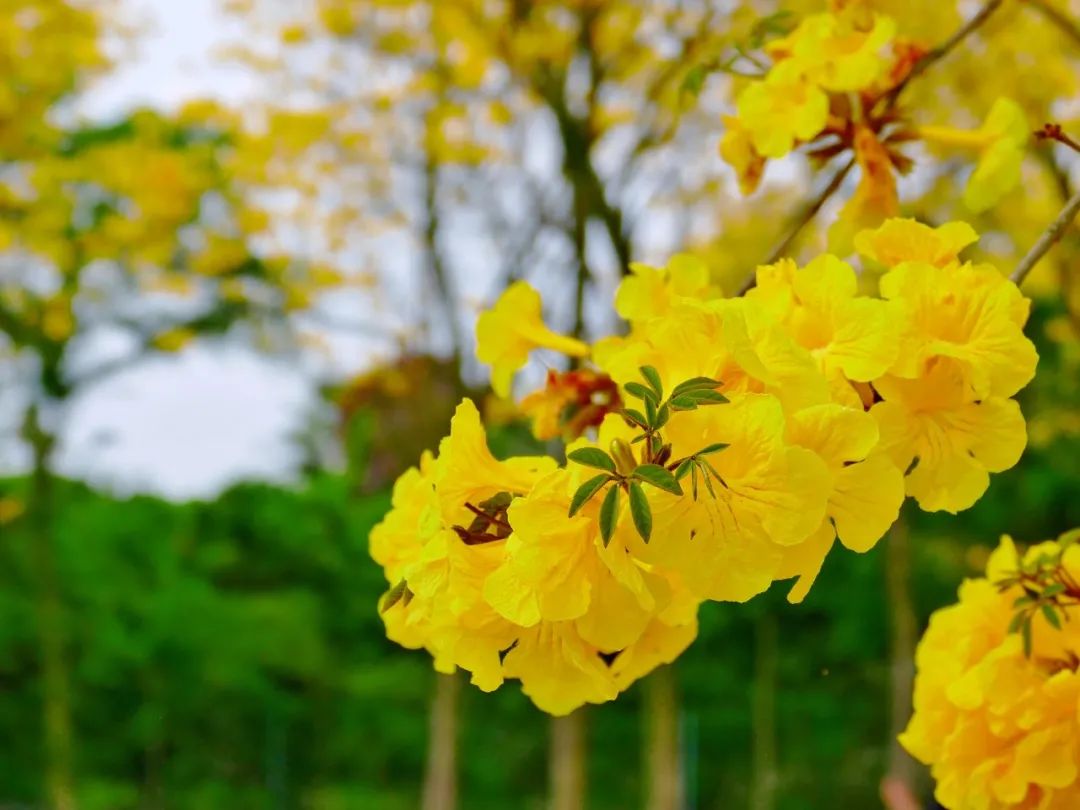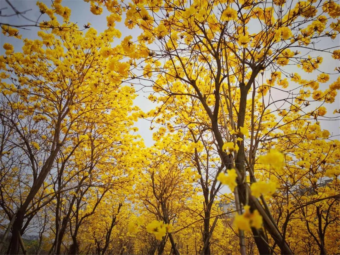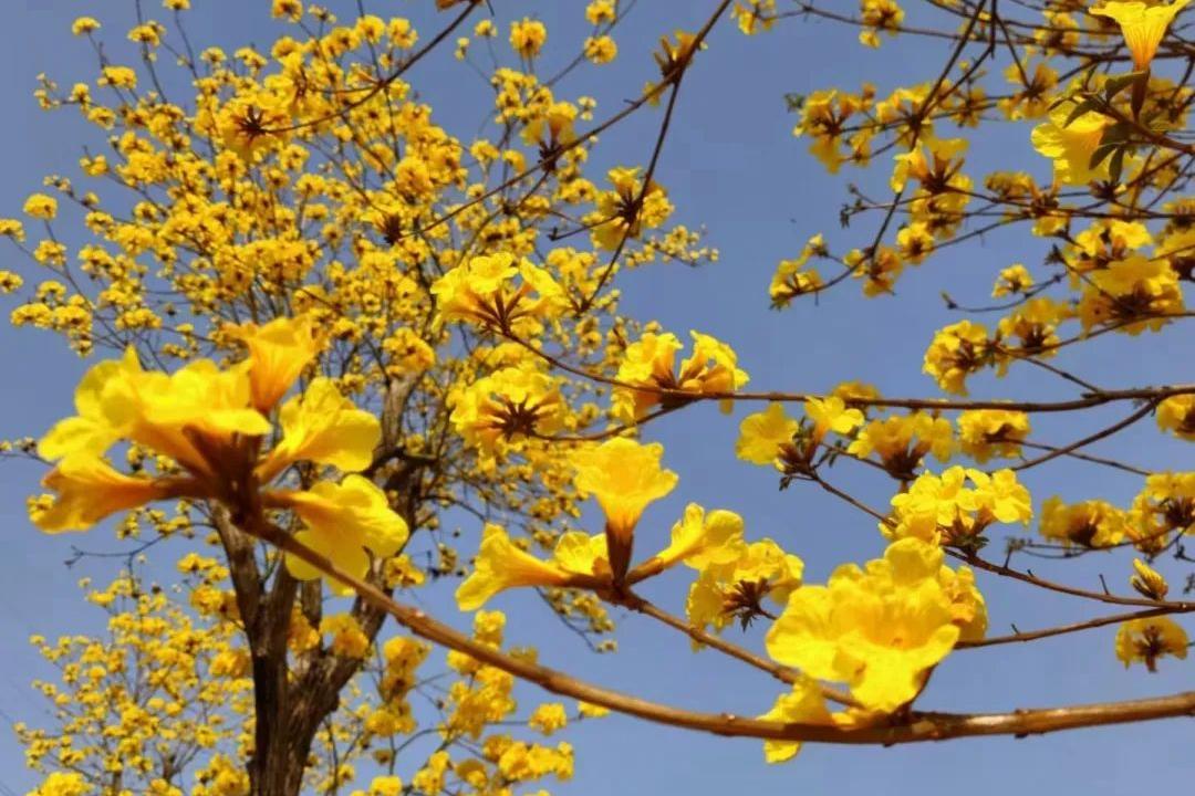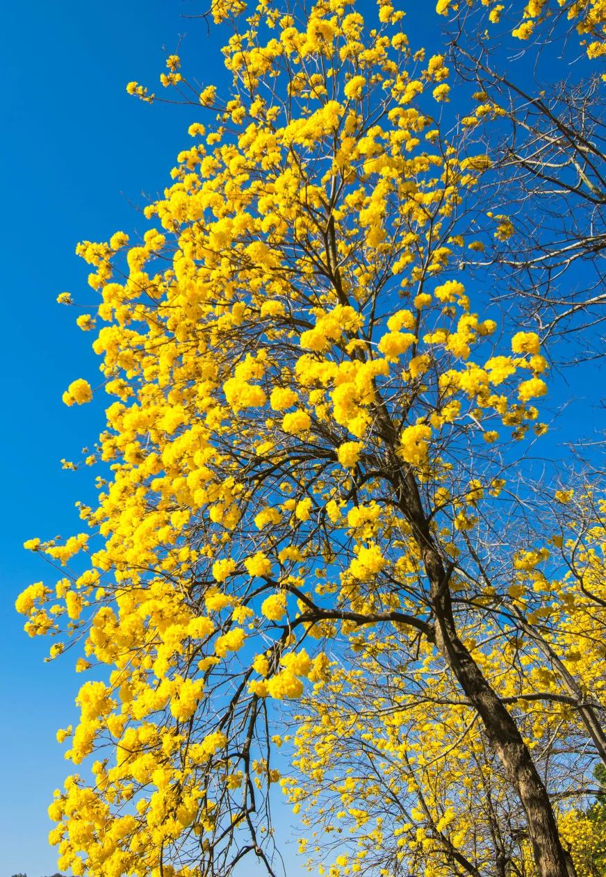 一株株金黄的黄花风铃木花满枝头,如朵朵柔软的云朵,放眼望去,有如披挂着一身“黄金甲”。