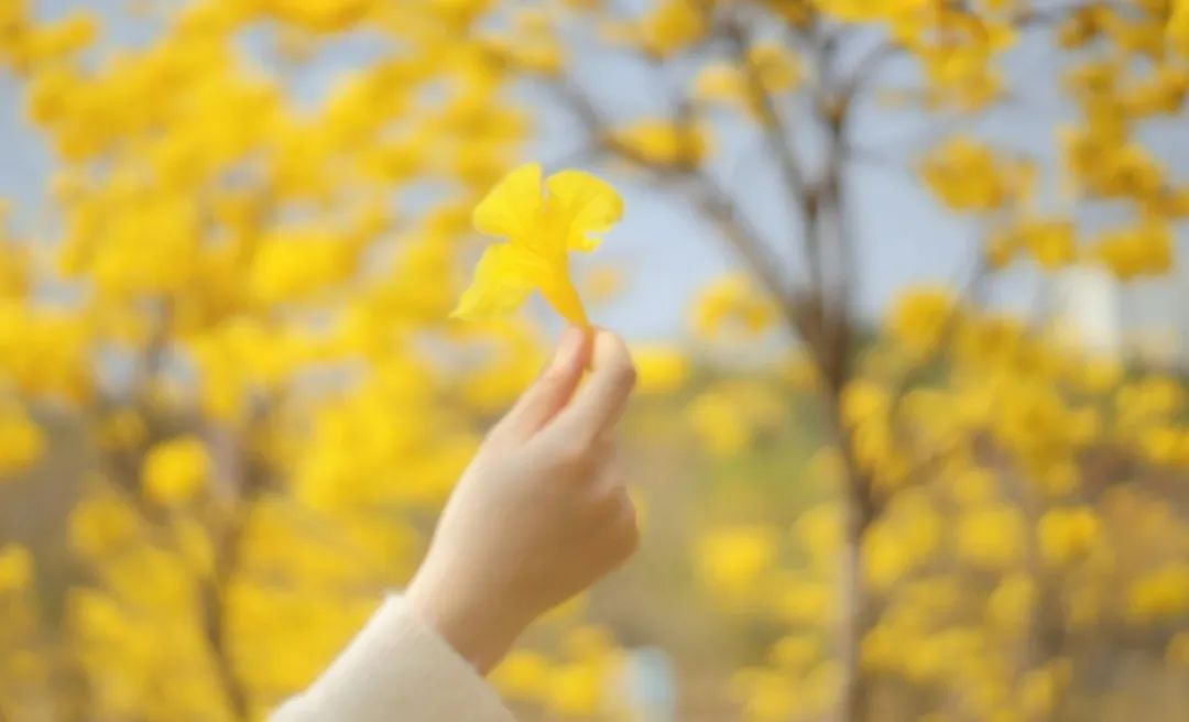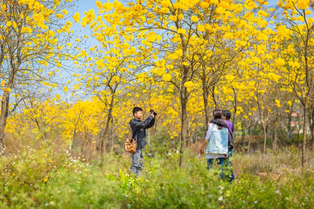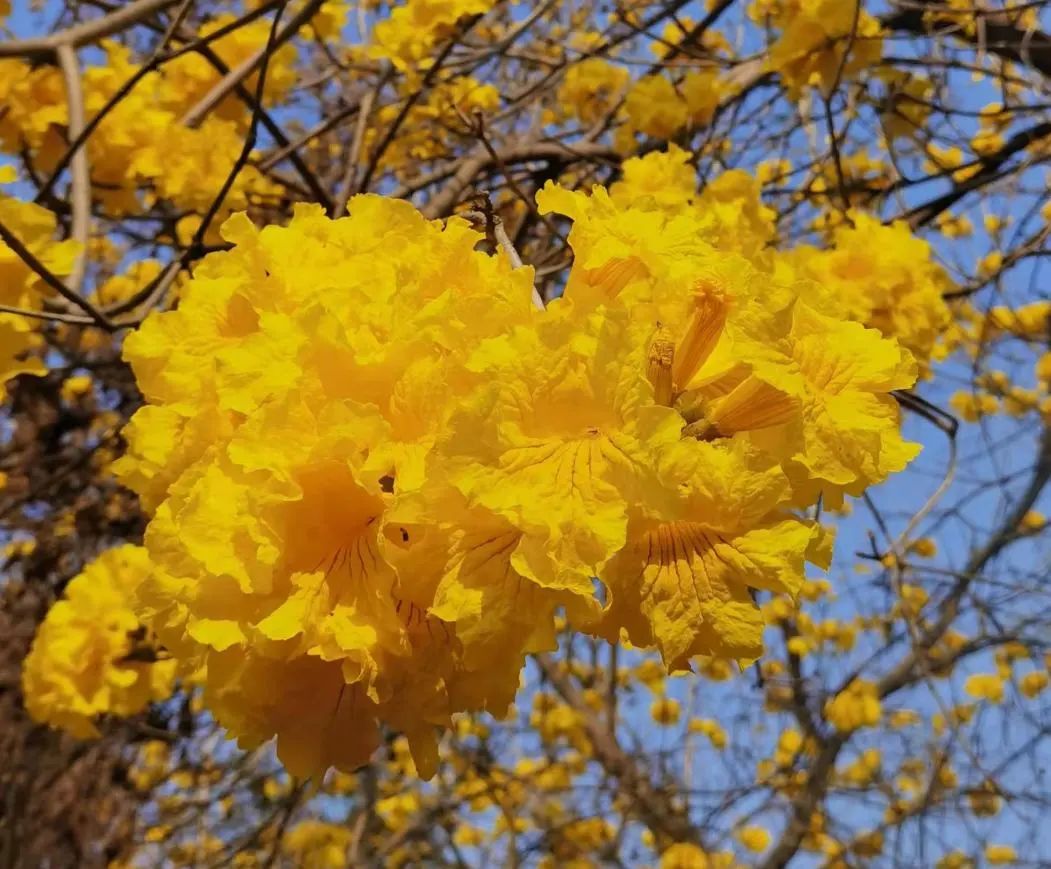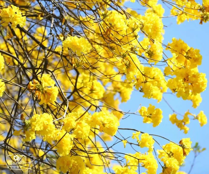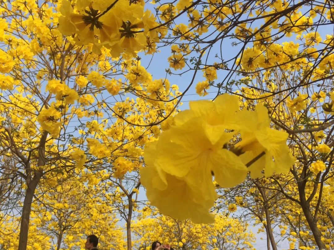 金黄的枝丫,在蓝天的辉映下显得格外亮眼。走进这连成片的花海,像是瞬间踏入了一幅由大自然精心绘制的油画之中。