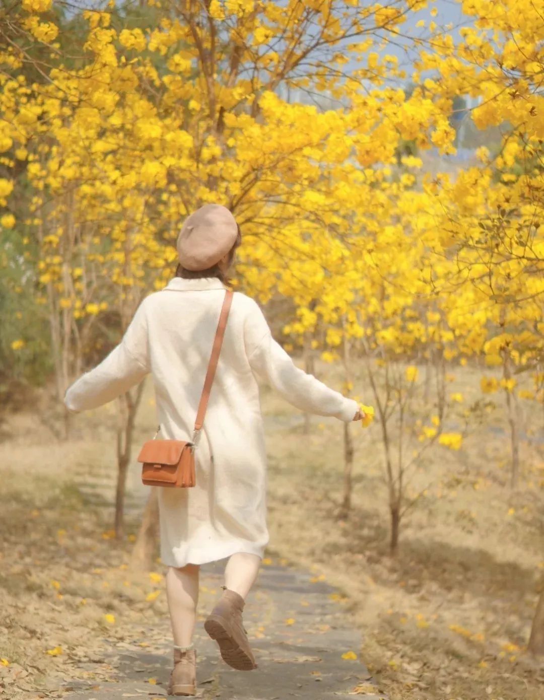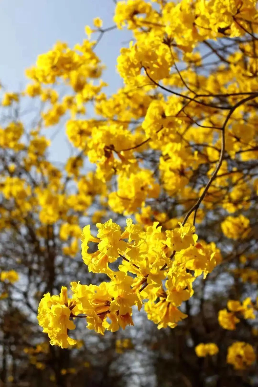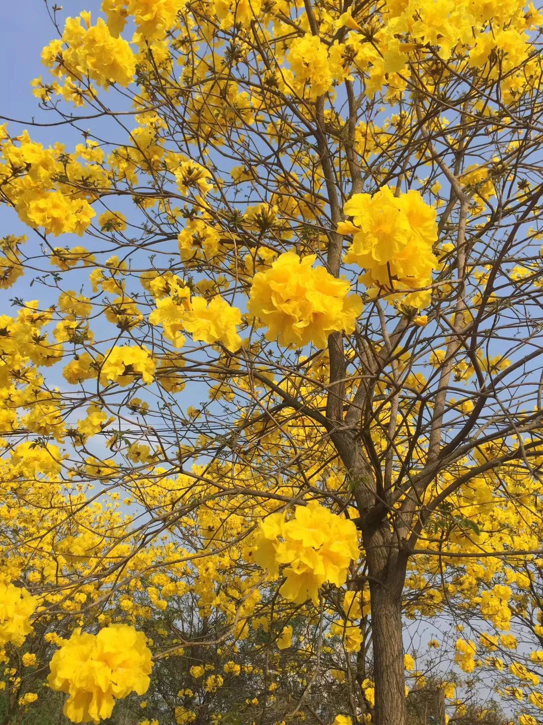 金黄的枝丫,在蓝天的辉映下显得格外亮眼。走进这连成片的花海,像是瞬间踏入了一幅由大自然精心绘制的油画之中。