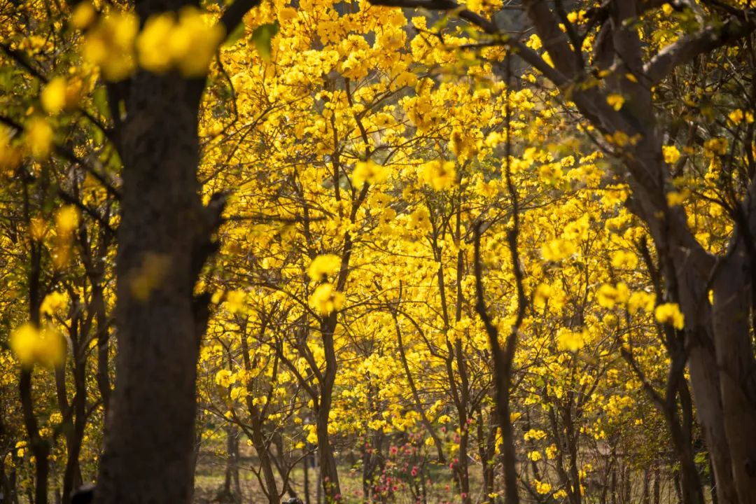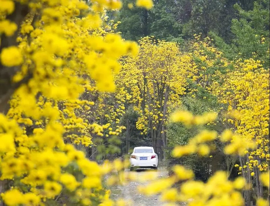 黄风铃木,为巴西国花,是一种随着四季变化而更换风貌的树木,花期只有10-15天,花一开便叶子迅速凋落,所以留的一树繁花无叶。简阳东麓花溪,这处秘境宝藏线路便有高达1800亩的风铃哦!
