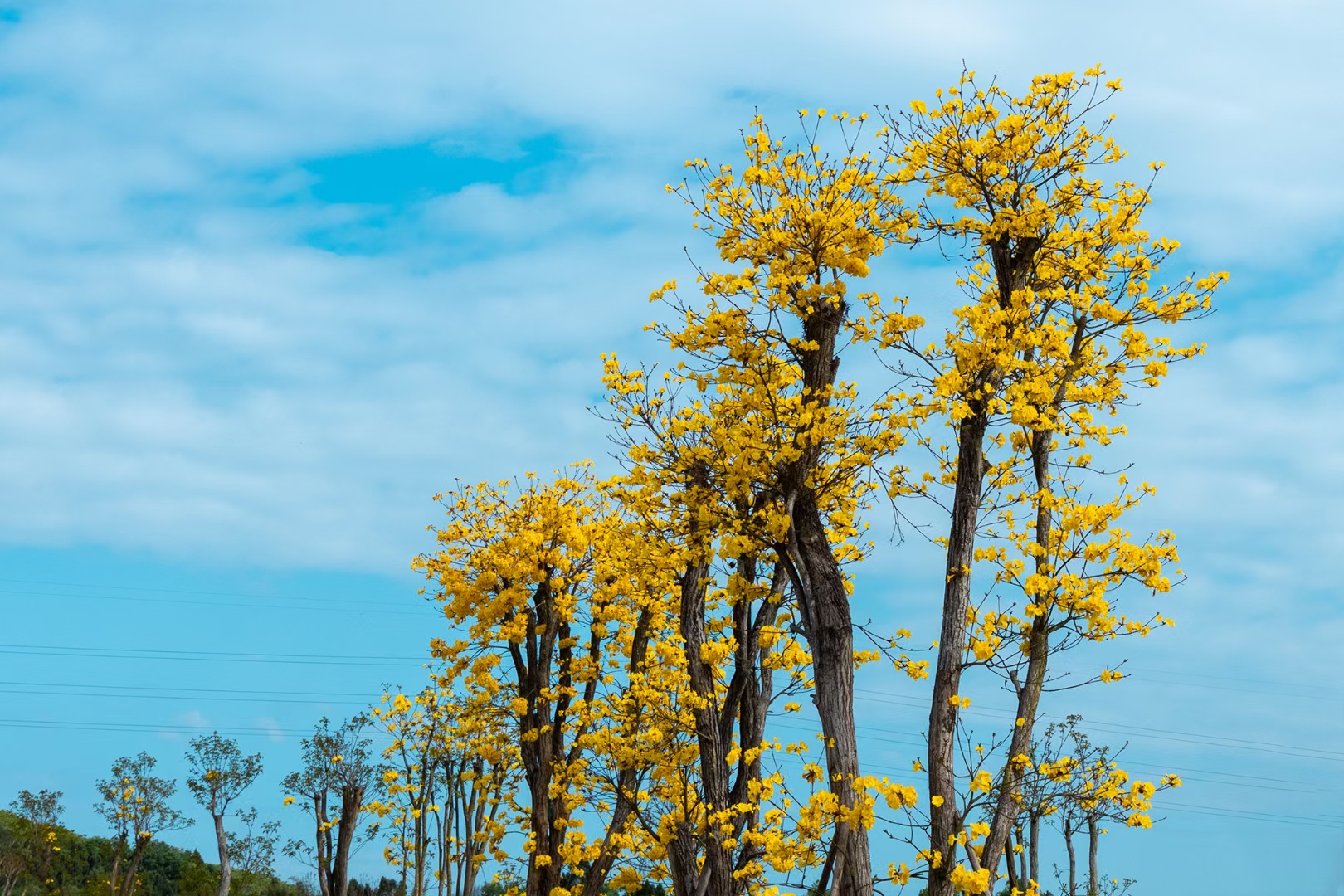 远远望去,一棵棵风铃木排排站,远看像一条条黄色丝带织就的丝绸,亮得惊艳又浓烈。微风拂来,一朵朵黄花在春光中摇曳,多了几分明艳的灵动。